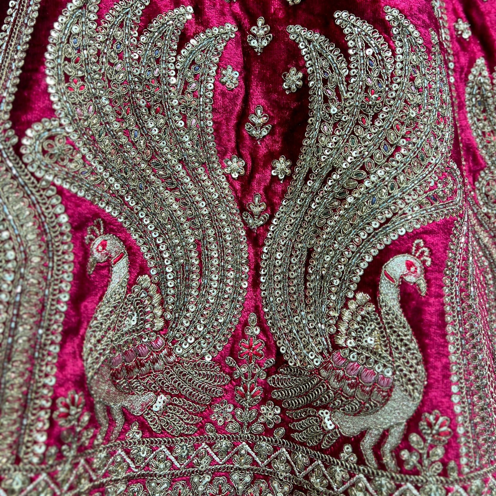 Elevate your wedding style with this big flared Rajwadi lehenga for bride from the Amrapali collection. This designer piece will give you the perfect lehenga look for bride. The lehenga features beautiful peacocks with handwork detailing giving it a bold yet subtle royal look. Whether you are looking for the timeless maroon bridal lehenga or the trending royal red bridal look, the rich velvet blouse paired with silk lehenga and intricate detailing make it a top choice for the contemporary bride!