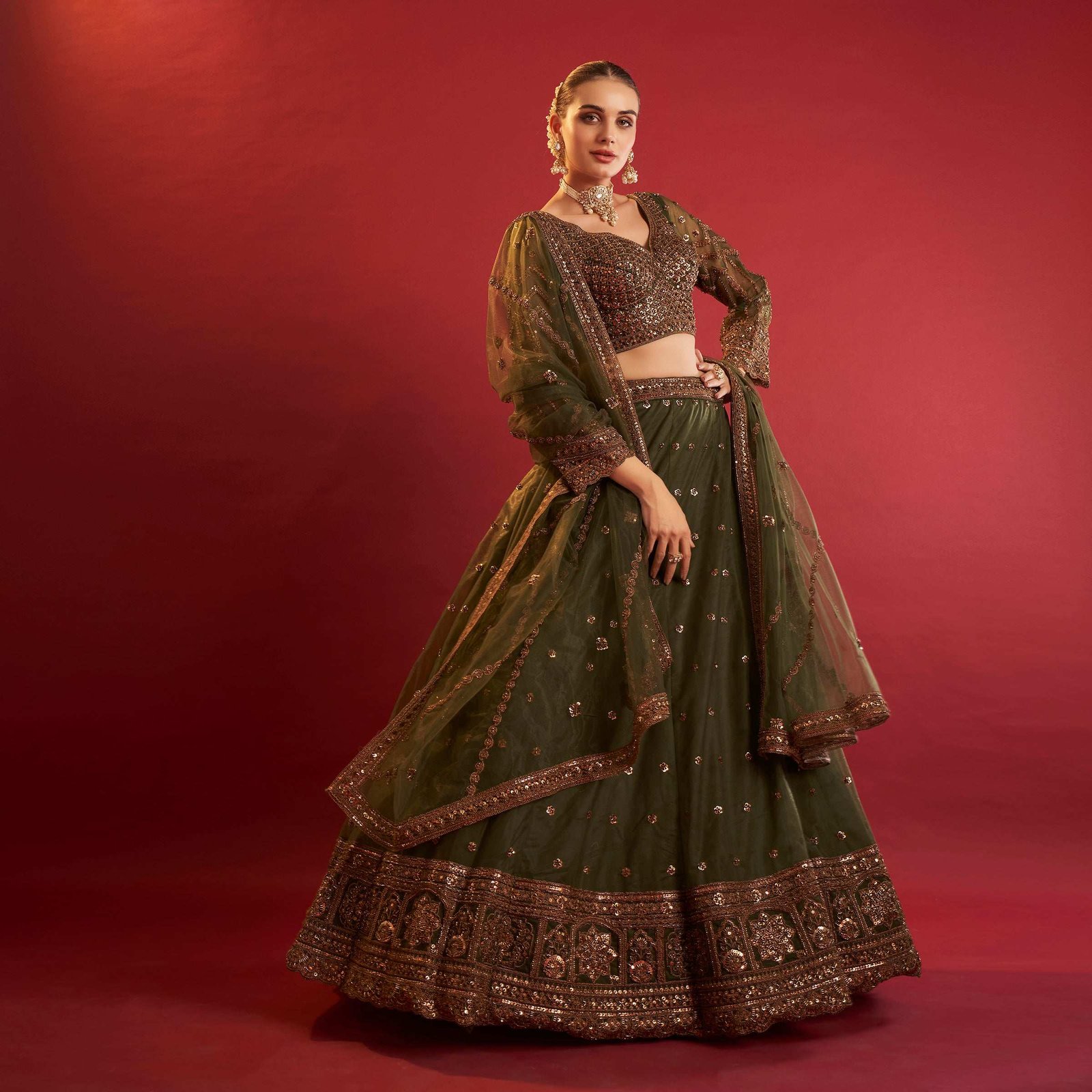 Whether you’re after a reception golden bridal lehenga or an engagement lehenga look that leaves a lasting impression, the Celestial Collection offers a variety of designs to suit your taste. The light, airy net fabric provides comfort and ease of movement, making these lehengas perfect for festive celebrations