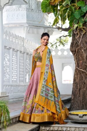 Doli – Kalamkari Print Dola Silk Onion Pink Multicolor Lehenga Set