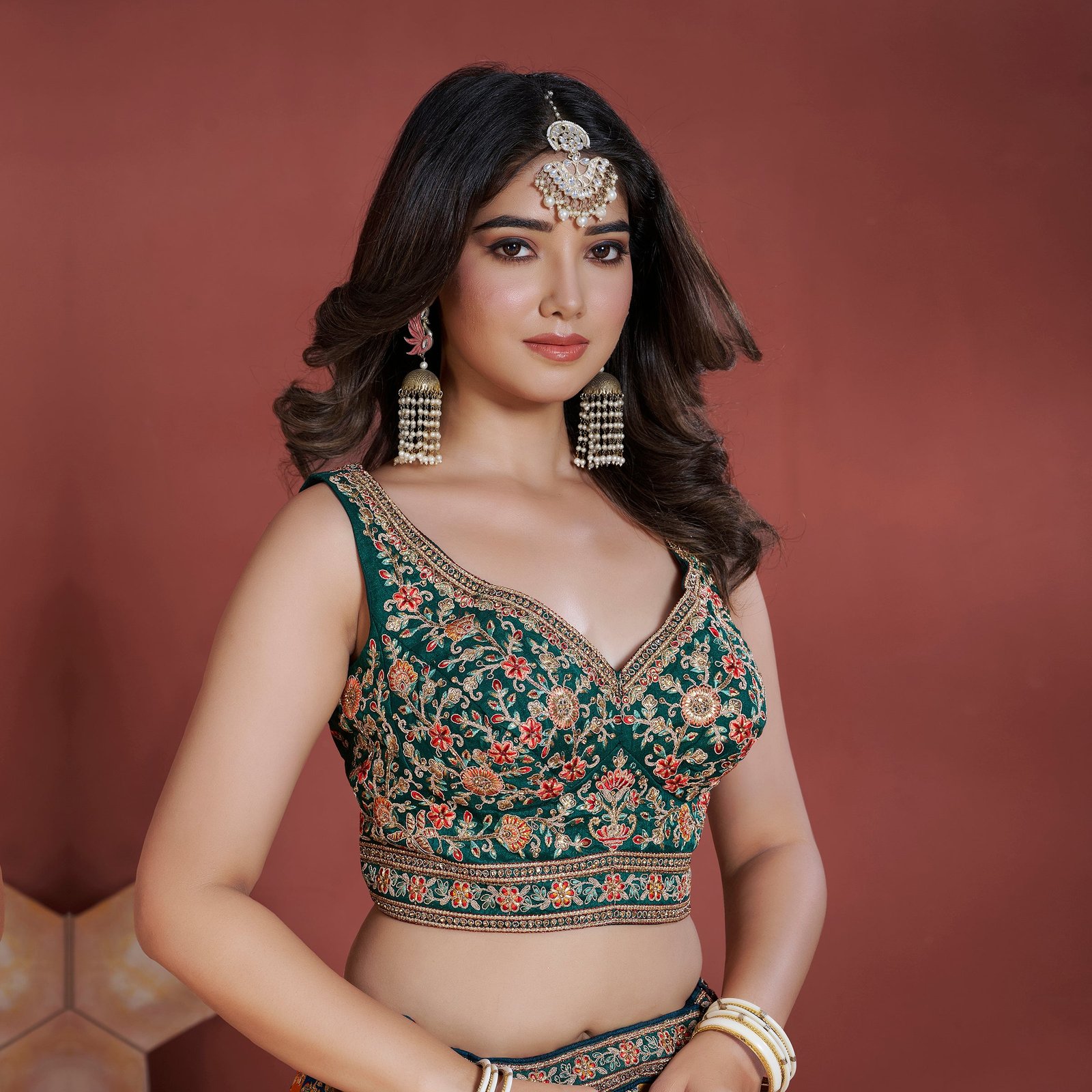 This exquisite ensemble comes with a pre-stitched sleeve less blouse and lehenga, with sleeves provided separately. The blouse are stitched in size 36/38 expandable upto 42 inches